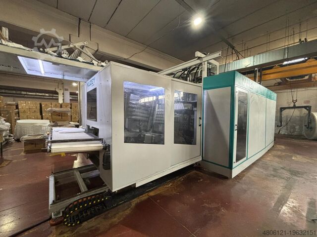 Condizione: pronta per il funzionamento (usata), Anno di produzione: 2004, Funzionalità: perfettamente funzionante, numero macchina/veicolo: 202-052, larghezza film: 570 mm, tipo di corrente in ingresso: trifase, pressione: 6 barra, larghezza totale: 25.800 mm, lunghezza totale: 82.200 mm, altezza totale: 22.800 mm, Macchina termoformatrice usata, funzionale per PET, PS, PP.